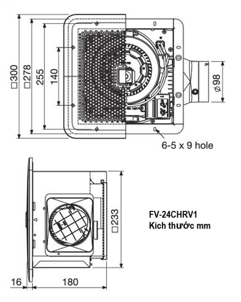 Kích thước phần âm trần180mm chiều cao (chiều dày)233mm chiều ngang ➜ Khoét lỗ vuông 240mm